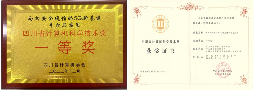 会中,对获得2022年“四川省计算机科学技术奖”的单位进行了表彰颁奖,中全通公司、电子科大宜宾研究院联合研发的项目“面向安全通信的5G新基建平台与应用”,荣获2022年“四川省计算机科学技术奖”一等奖,该项目主要完成人有黄凯、李宇、郑位春、陈杰、兰平等7人。